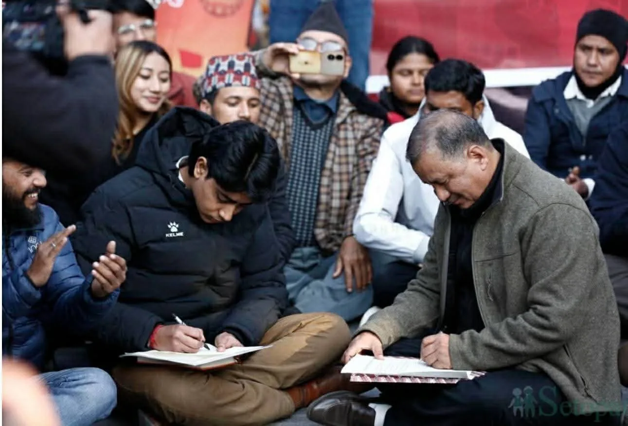 काठमाडौं, २ माघ । नेत्रविक्रम चन्द नेतृत्वको नेपाल कम्युनिष्ट पार्टी (माओवादी) र संयुक्त जेनजी आन्दोलनका संयोजक मिराज ढुंगानाबीच जेनजी विद्रोहका मागहरु पूरागर्न संघर्र्षगर्ने लगायत चारबुँदे सहमति भएको छ । सर्वपक्षीय सहमति र अन्तरिम सरकार गठनका लागि संघर्र्षगर्ने, आन्दोलन र जनताको चाहना बमोजिम संविधान संशोधन, स्थिर सरकार र भ्रष्टाचार विरुद्ध विशेष न्यायिक निकाय गठन, राज्यको अग्रगामी पुनर्संरचनाका लागि संयुक्तरुपमा संघर्र्षगर्ने जस्ता विषय समावेश सहमतिपत्रमा महासचिव चन्द र संयोजक ढुंगानाले माइतीघर मण्डलामा हस्ताक्षर गर्नुभएको हो । ढुंगाना नेतृत्वको समूह पछिल्लो केही दिनदेखि बिभिन्न माग राखी माइतीघर मण्डलामा धर्नामा बस्दैआएको छ ।