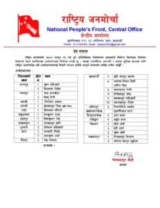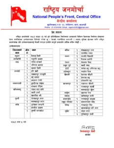 काठमाडौं, ६ माघ । राष्ट्रिय जनमोर्चाले ४० जिल्लाका बिभिन्न क्षेत्रबाट उम्मेदवारी दिने भएको छ । अध्यक्ष चित्रबहादुर केसीको हस्ताक्षरमा हिजो माघ पाँचगते जारी दुईवटा फरक, फरक वक्तव्यमा सो जानकारी दिइएको छ । वक्तव्यकाअनुसार प्युठानमा तिलक जिसी, अर्घाखाँचीमा पशुपति ढकाल, दाङ १ मा गणेश आचार्य, दाङ २ मा मनिराम खनाल, दाङ ३ मा कमला जिसी, रुपन्देही १ मा हरि केसी, रुपन्देही २ मा रुकबहादुर पराजुली, रुपन्देही ३ मा बद्रे आलम, रुपन्देही ४ मा जयश्वर रेग्मी, नवलपरासी १ मा ढुण्डीराज पोख्रेल, नवलपरासी २ मा सम्झना पौडेल, कपिलवस्तु १ मा माधव भाट क्षेत्री, कपिलवस्तु २ मा लक्ष्मी शर्मा र कपिलवस्तु ३ मा केरसिंह अदै राजमोको उम्मेदवार बन्दै हुनुहुन्छ ।